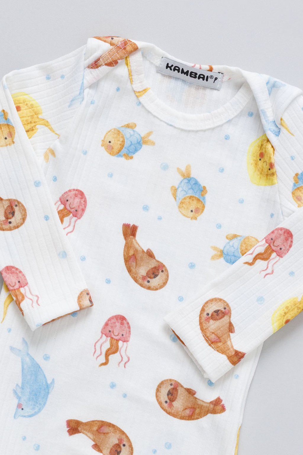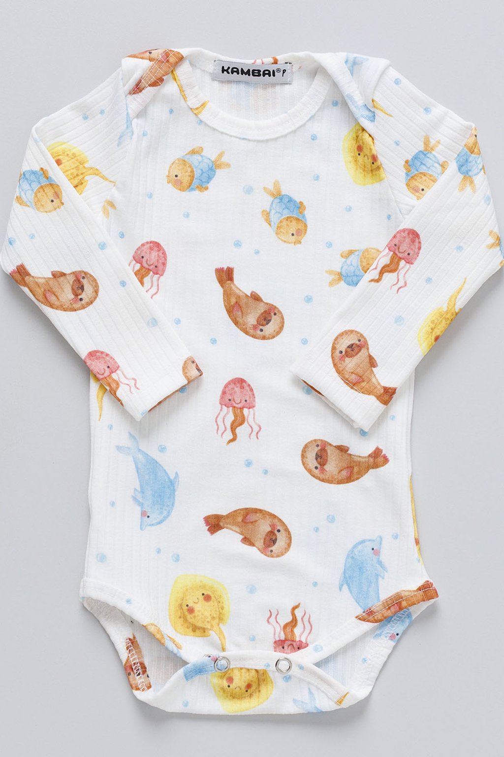 Body Bebê Manga Longa Canelado Estampa Animais Marinhos