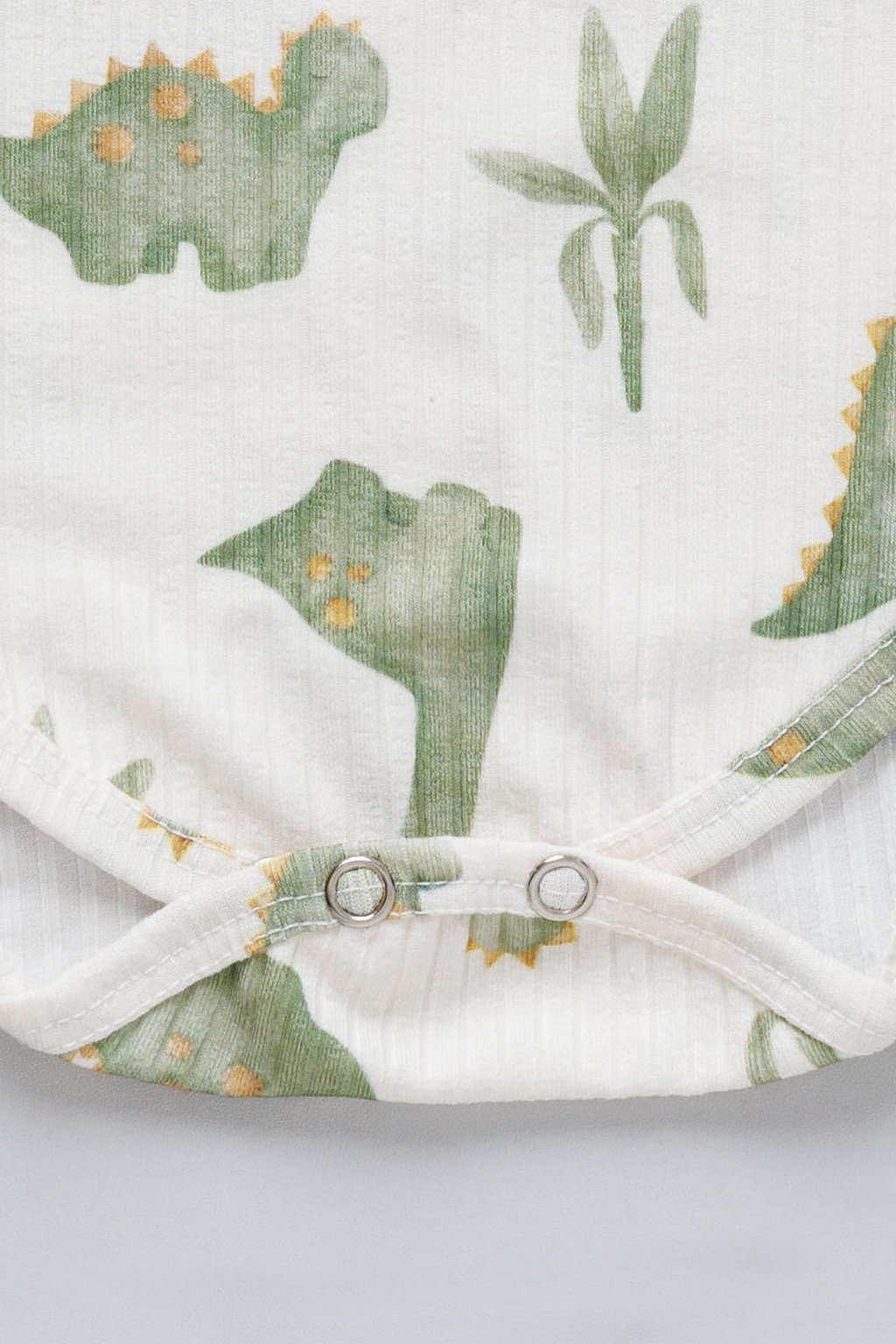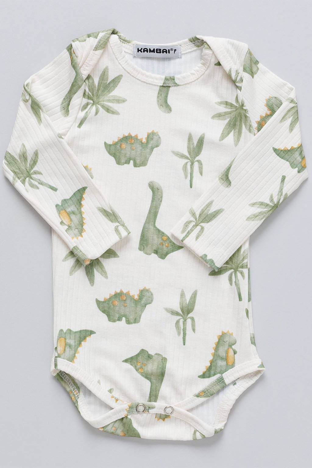 Body Bebê Manga Longa Canelado Estampa Dinossauro Tropical