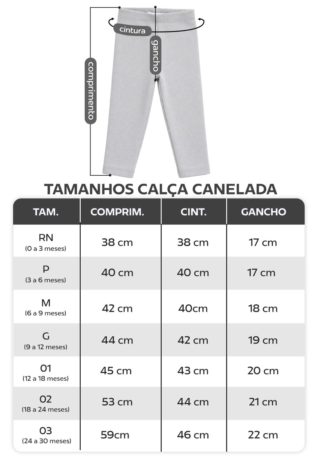 Confeccionada em malha canelada macia e flexível, a calça se ajusta suavemente ao corpinho, proporcionando caimento confortável sem apertar a barriguinha. O tecido respirável contribui para o conforto térmico, enquanto o design versátil permite composições práticas com bodies e blusas.