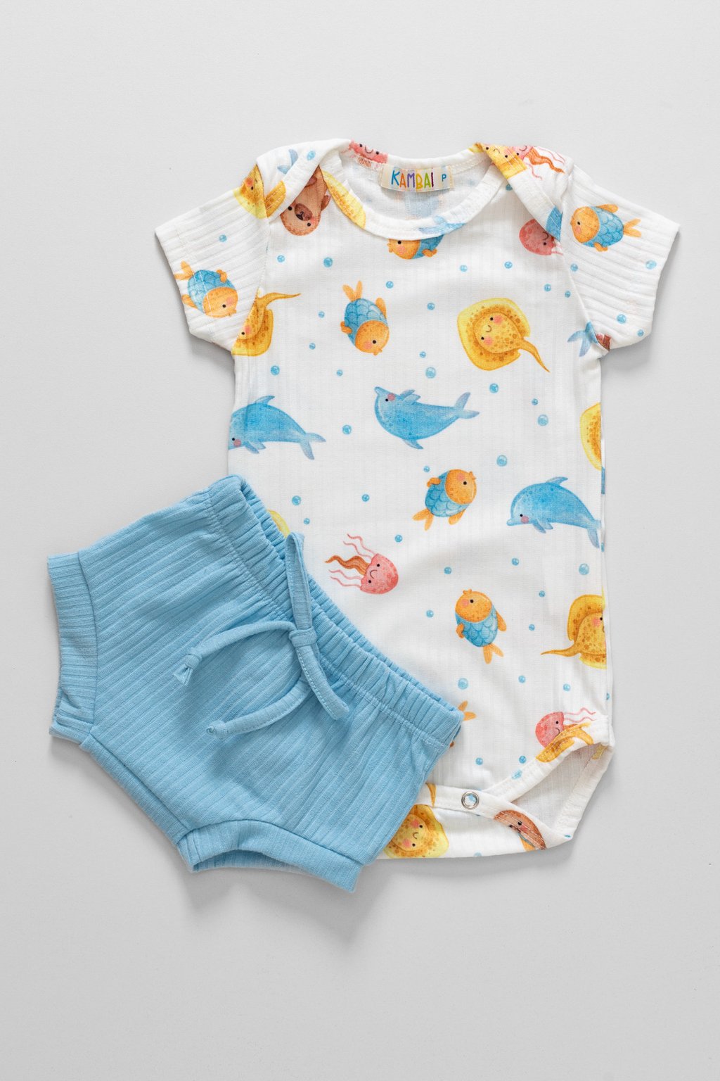 Detalhes: Body com botões de pressão entrepernas e gola envelope. Short tapa fralda com elástico na cintura.