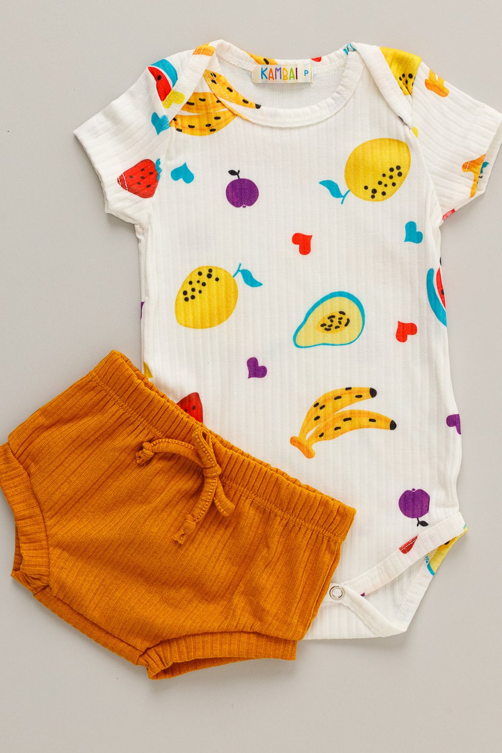 Detalhes: Body com botões de pressão entrepernas e gola envelope. Short tapa fralda com elástico na cintura.