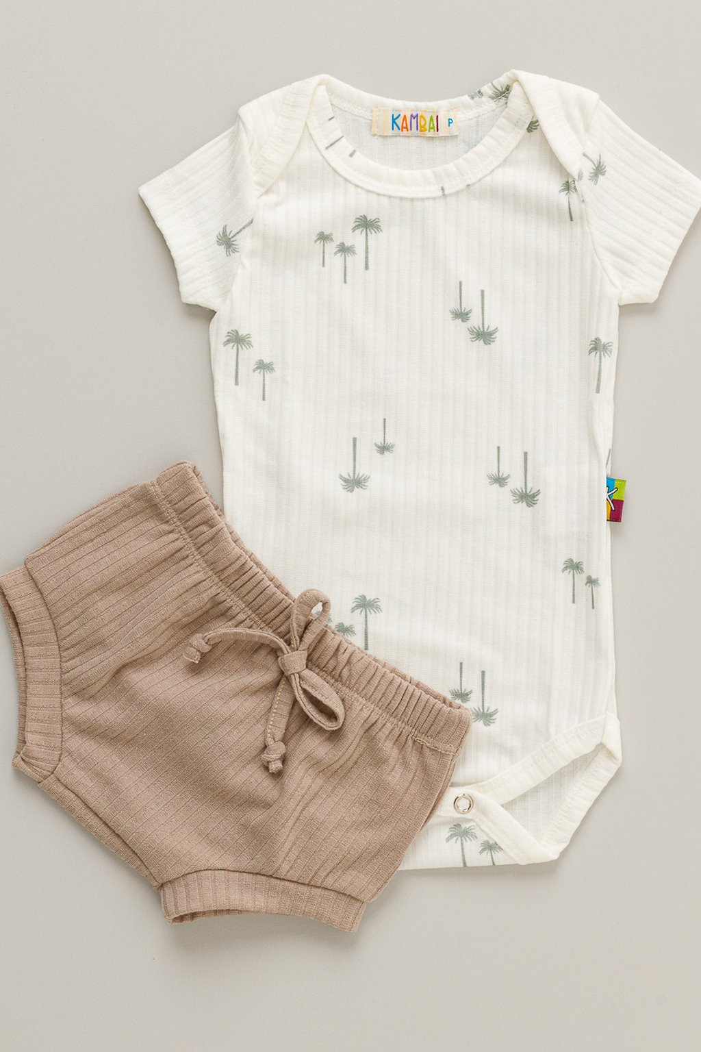 Detalhes: Body com botões de pressão entrepernas e gola envelope. Short tapa fralda com elástico na cintura.