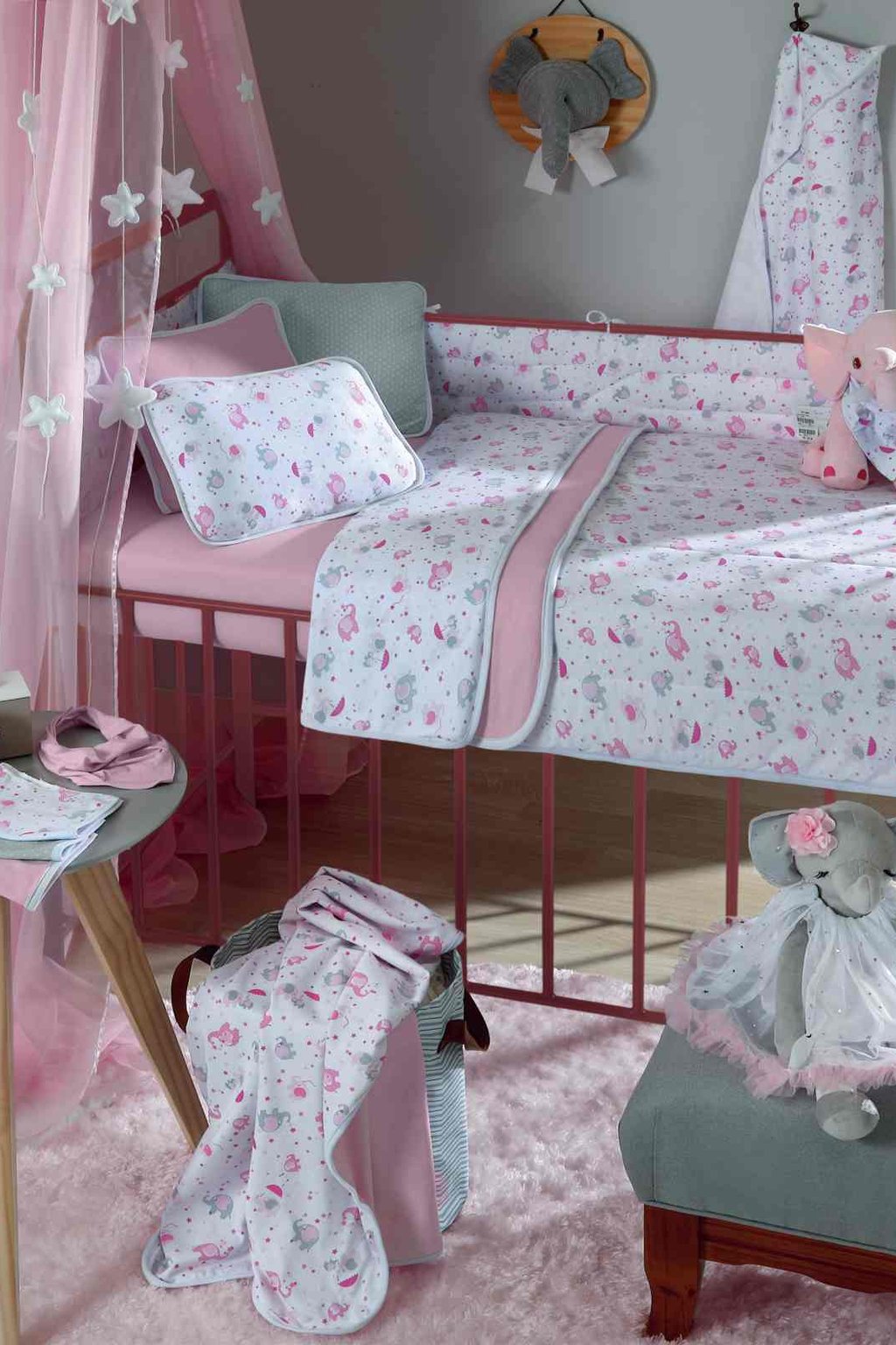 Jogo de Cama Bebê 3 Peças - Lençol Liso, Fronha Estampada e Sobre Lençol Estampado Elefante