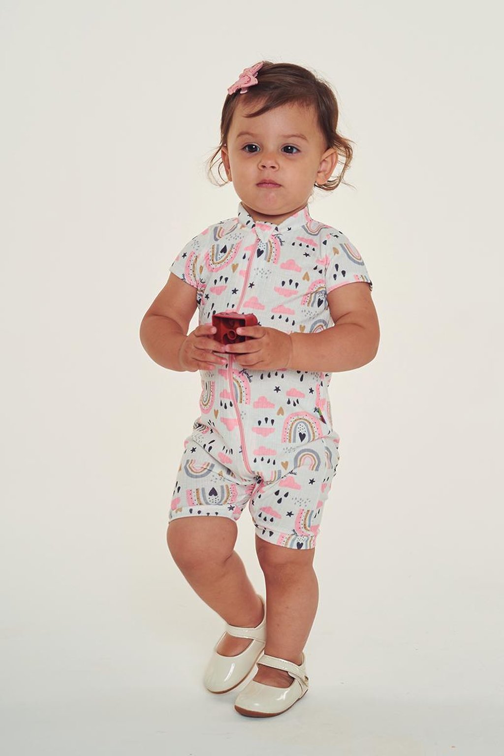 A textura canelada traz um visual delicado e moderno, enquanto a modelagem curta garante frescor e bem-estar nos dias mais quentes e em ambientes climatizados. Com zíper frontal que facilita vestir e trocar, é uma peça prática, funcional e perfeita para o dia a dia do bebê.